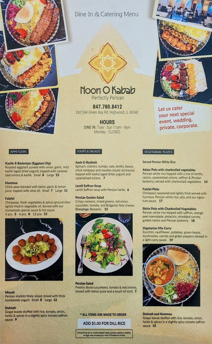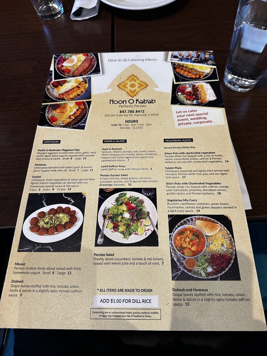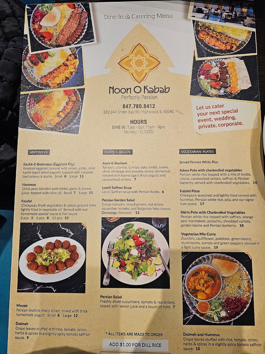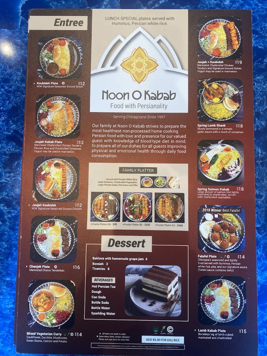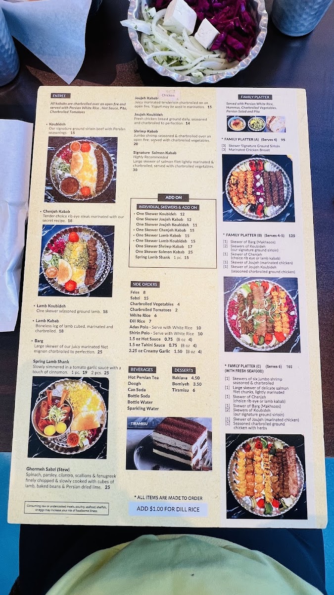 [3] Skewers Signature ground sirloin [3] Skewers Marinated chicken breast [1] Skewer Charbroiled Vegetable Served with rice, Hummus, pit and Persian salad.