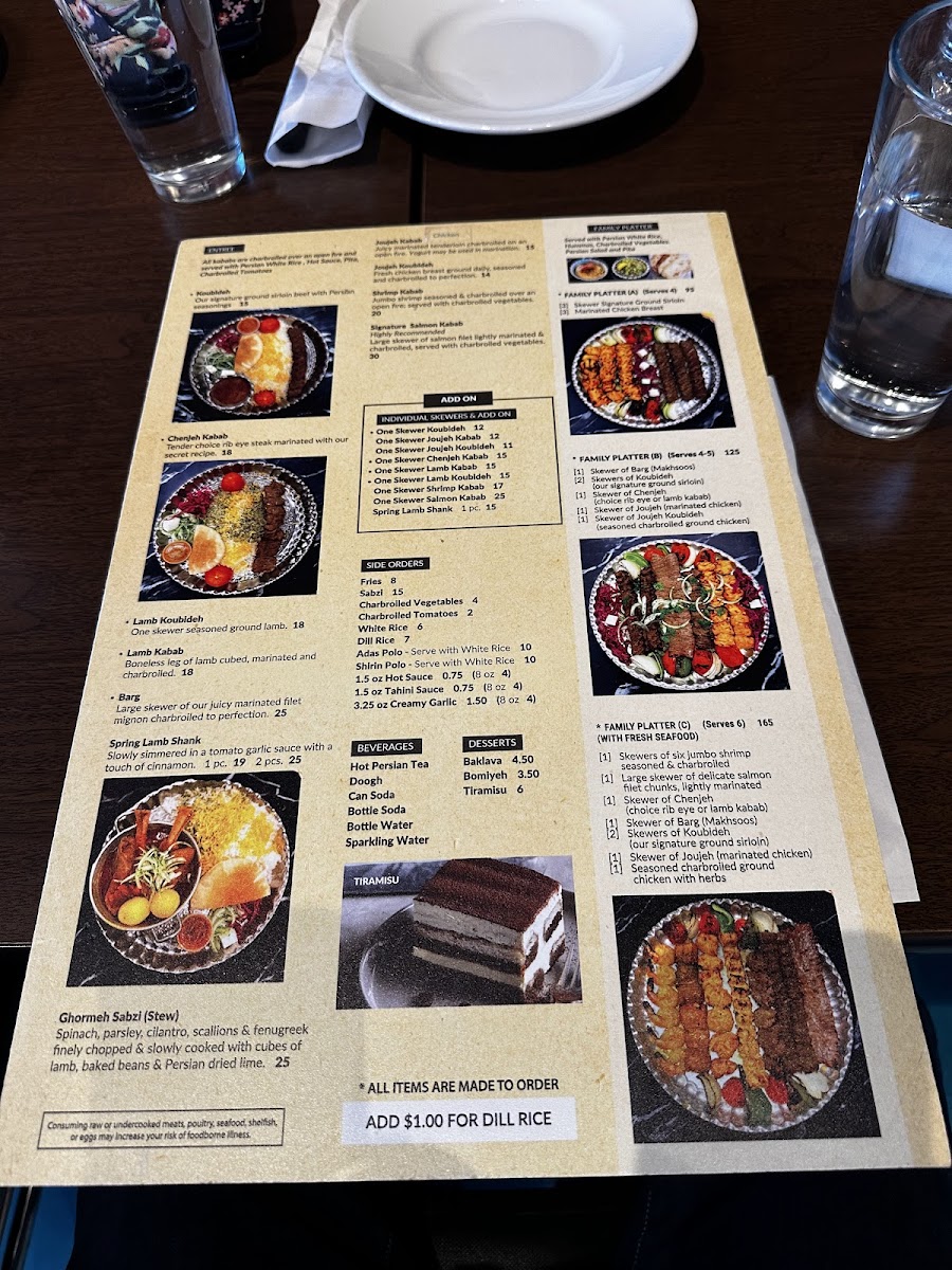 "[1] Skewer of Barg (Filet Mignon) [1] Skewer of Chenjeh (Choice Rib eye) [2] Skewer of Koubideh (Ground Sirloin) [1] Skewer of Joujeh (Marinated Chicken Breast) [1] Skewer of Joujeh Koubideh (Seasoned ground chicken) [1] Skewer Charbroiled Tomato or Vegetable [1] 12 oz Persian Salad [1] 12 oz Hummus [1] 8 oz Hot sauce Served with rice and Pita."